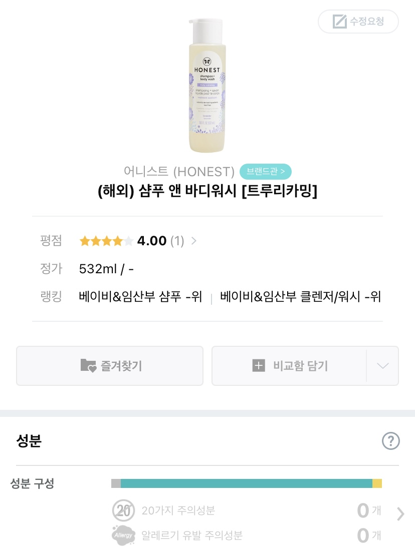 화해어플로 보니 어니스트 에브리데이젠틀, 젠틀리너리싱 향에서는 알로에베라잎즙 성분 때문에 알레르기 주의성분 1개가 나와요.